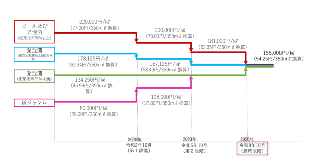 平成29年(2017年)度の税制改正により、段階的に進められてきた「発泡性酒類」の税率改正です 。